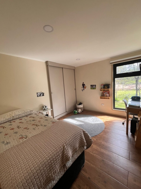 Vendo propiedad principal, mas cabaña, la casa principal cuenta con sector de lavandería, terraza, aire acondicionado y bosca. Mientras que a cabaña cuenta con habitación matrimonial, un baño, cocina americana, alacena, living y tiene bosca instalada. El patio cuenta con jardín, bodega pequeña, sector para guardar leña, espacio techado para gimnasio. La propiedad se encuentra ubicada en una parcelación cerrada con acceso por portón eléctrico, ademas de contar con agua de pozo para los habitantes de la parcelación. La propiedad en si cuenta con acceso con portón eléctrico tambien. Es una parcelación tranquila, con muchas áreas verdes, y se encuentra ubicada aproximadamente a 15 min en vehículo de el centro de Frutillar.